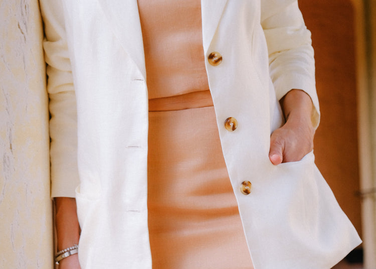 As one of the most naturally sustainable fibers, linen thrives with minimal water, grows without heavy pesticides & uses every part of the flax plant in a zero-waste process. Natural linen is recyclable, biodegradable & enduring, it drapes with quiet strength and remains beautiful for decades when properly cared for — a conscious investment in timeless style.