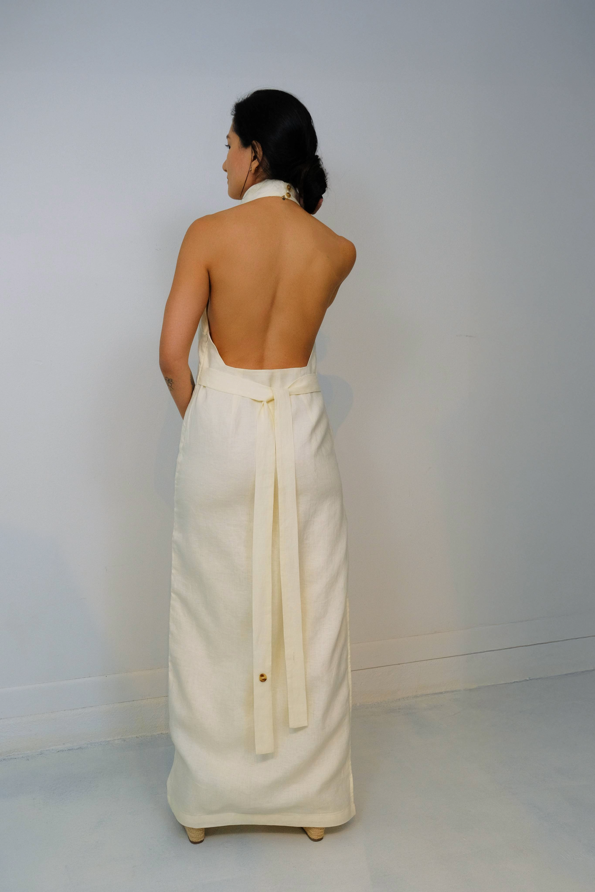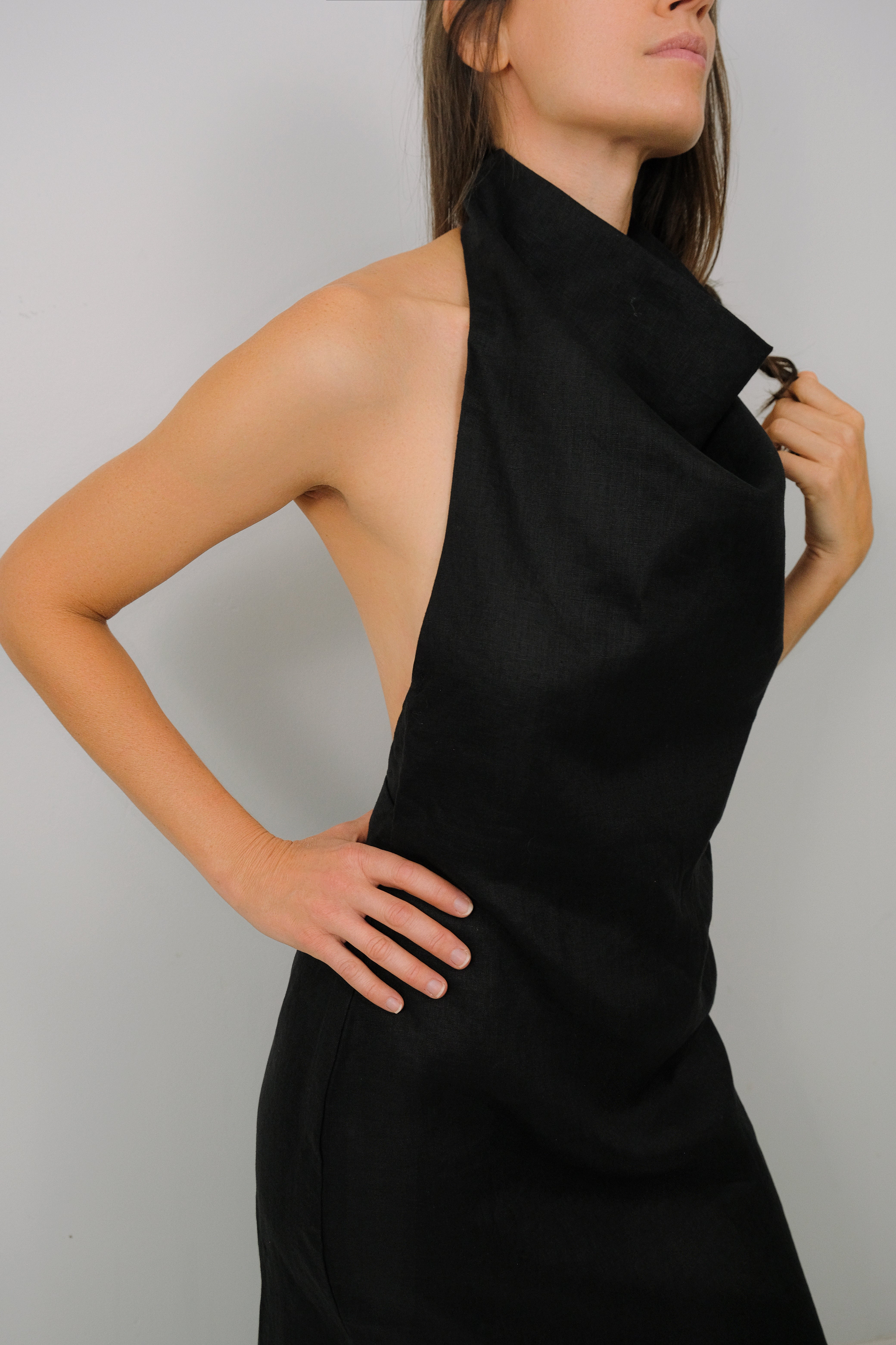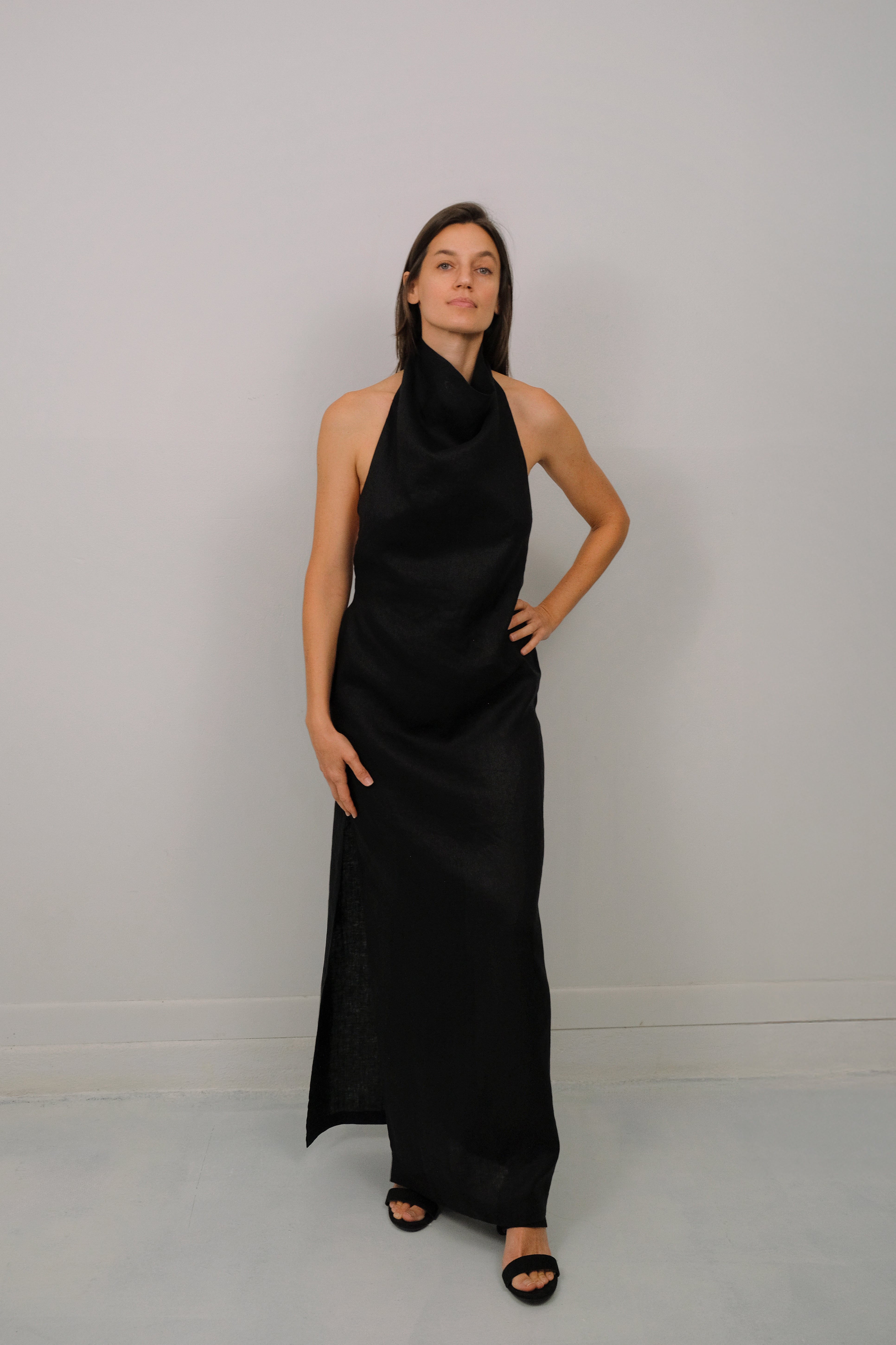 Our Tower Pure Linen Halter Dress, features a draping cowl-neck for timeless elegance with a unique sheath and slip silhouette hybrid and side slit.