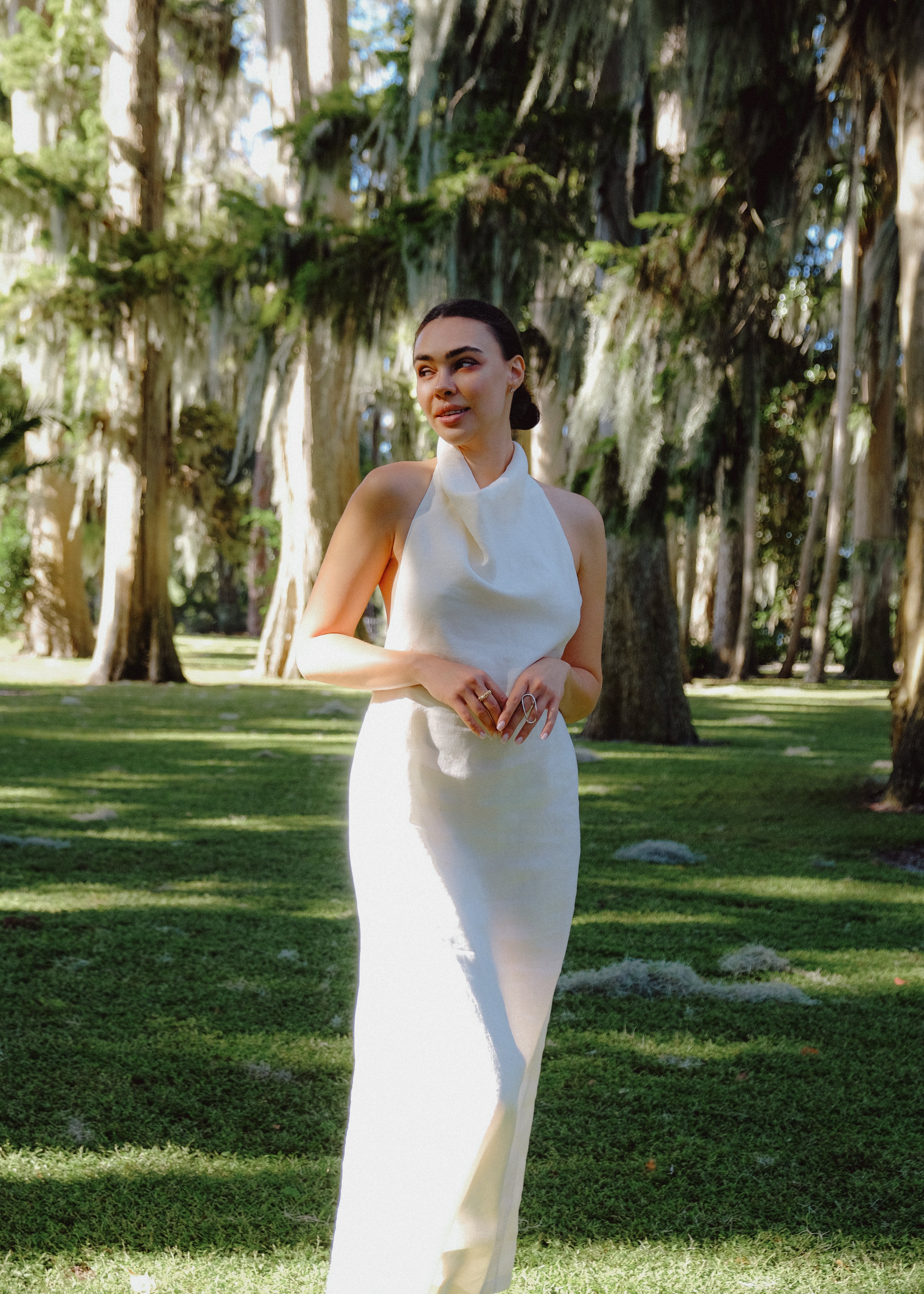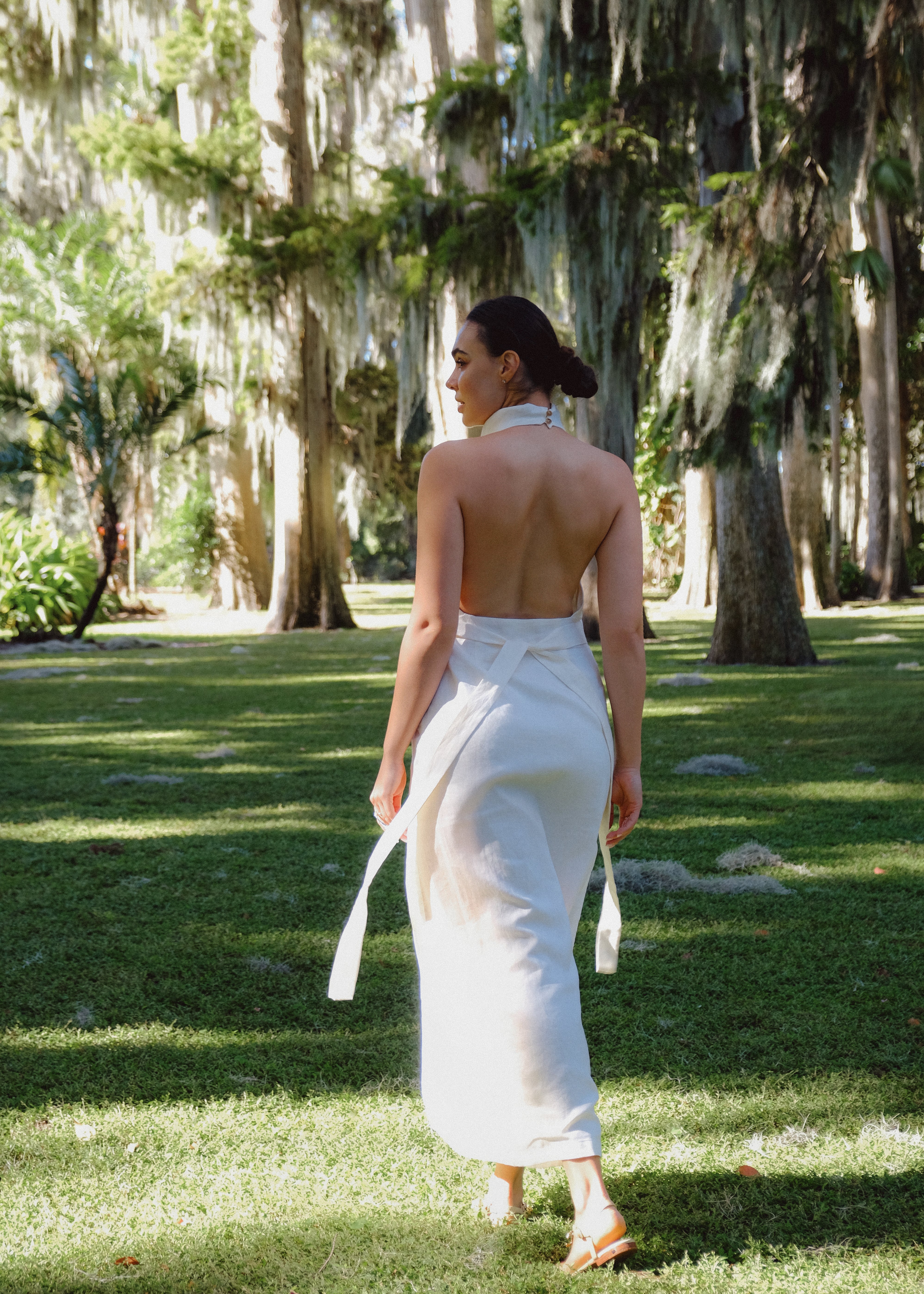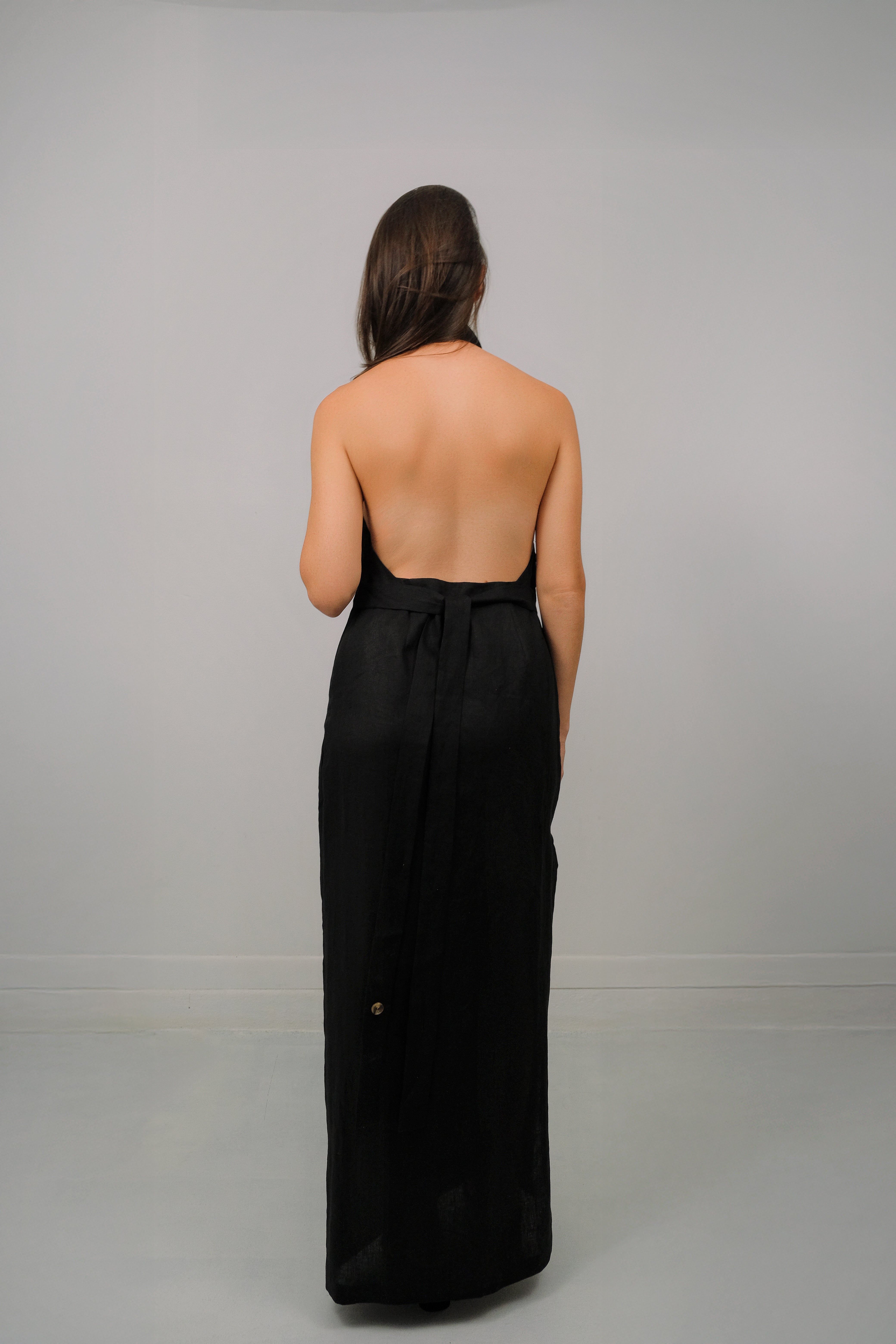 Our Tower Pure Linen Halter Dress, features a draping cowl-neck for timeless elegance with a unique sheath and slip silhouette hybrid and side slit.