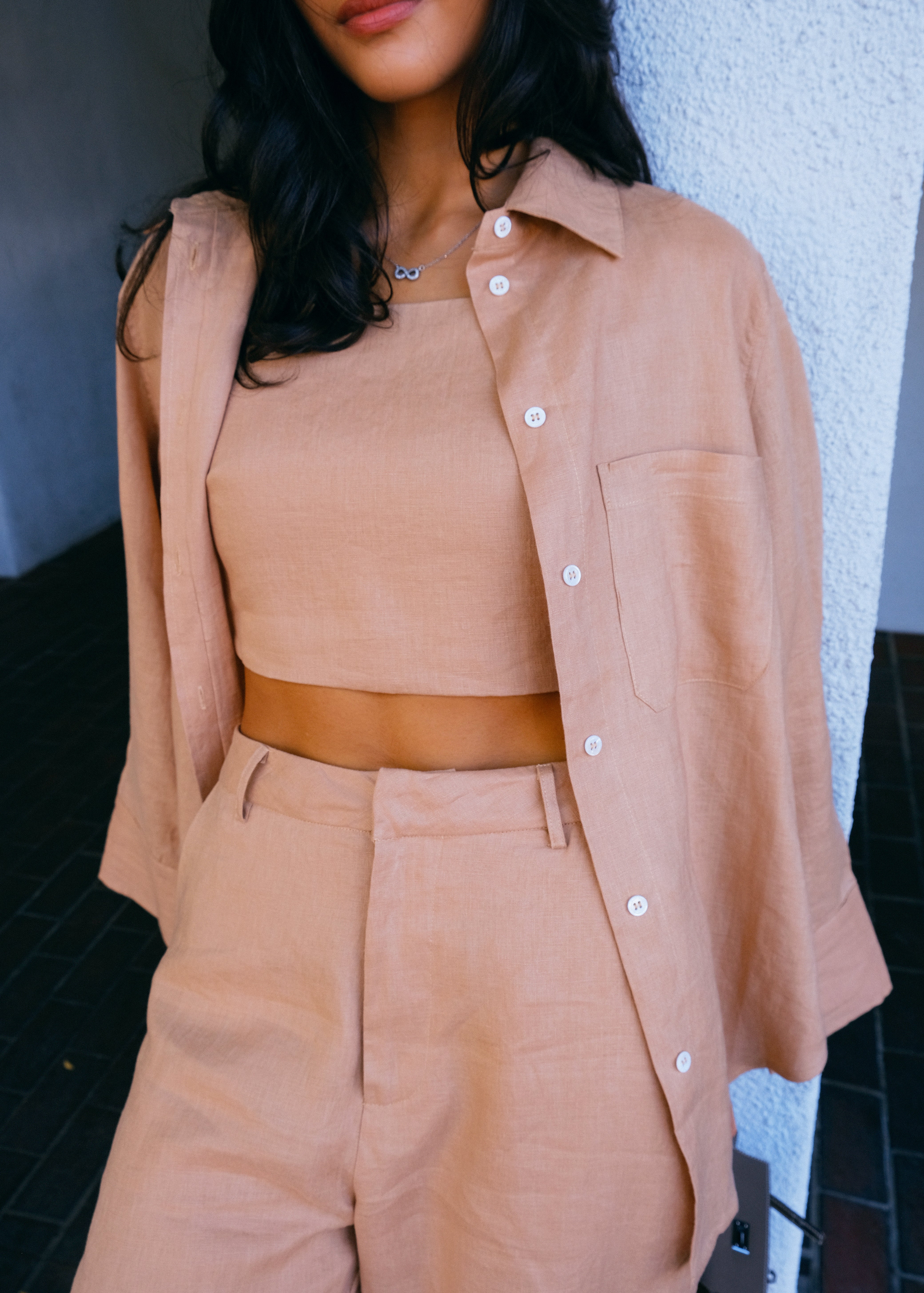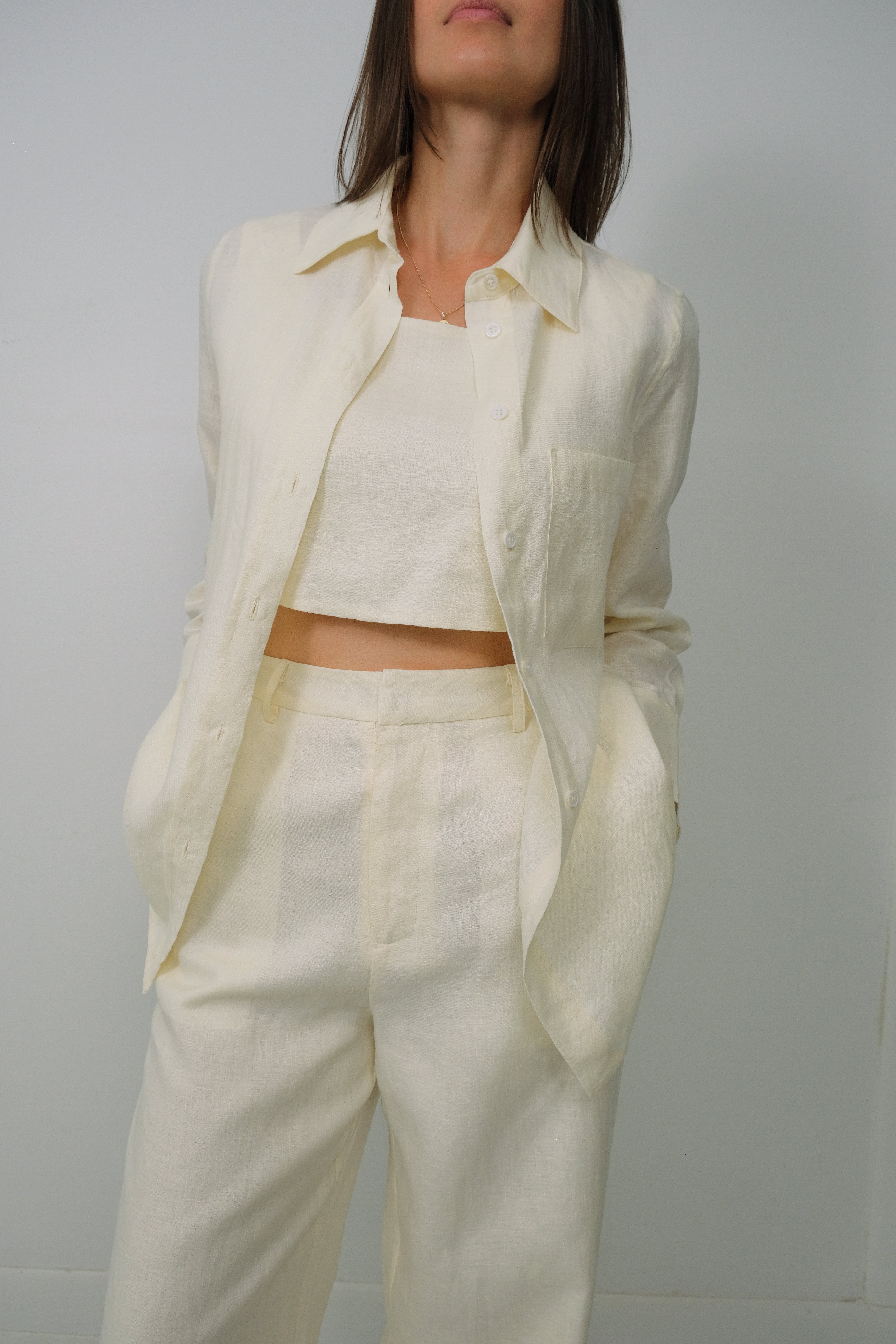 This pure linen set features a tailored linen midi crop top, high-waisted linen straight-leg pants and our relaxed Classic Button Linen shirt for layering or standalone wear.