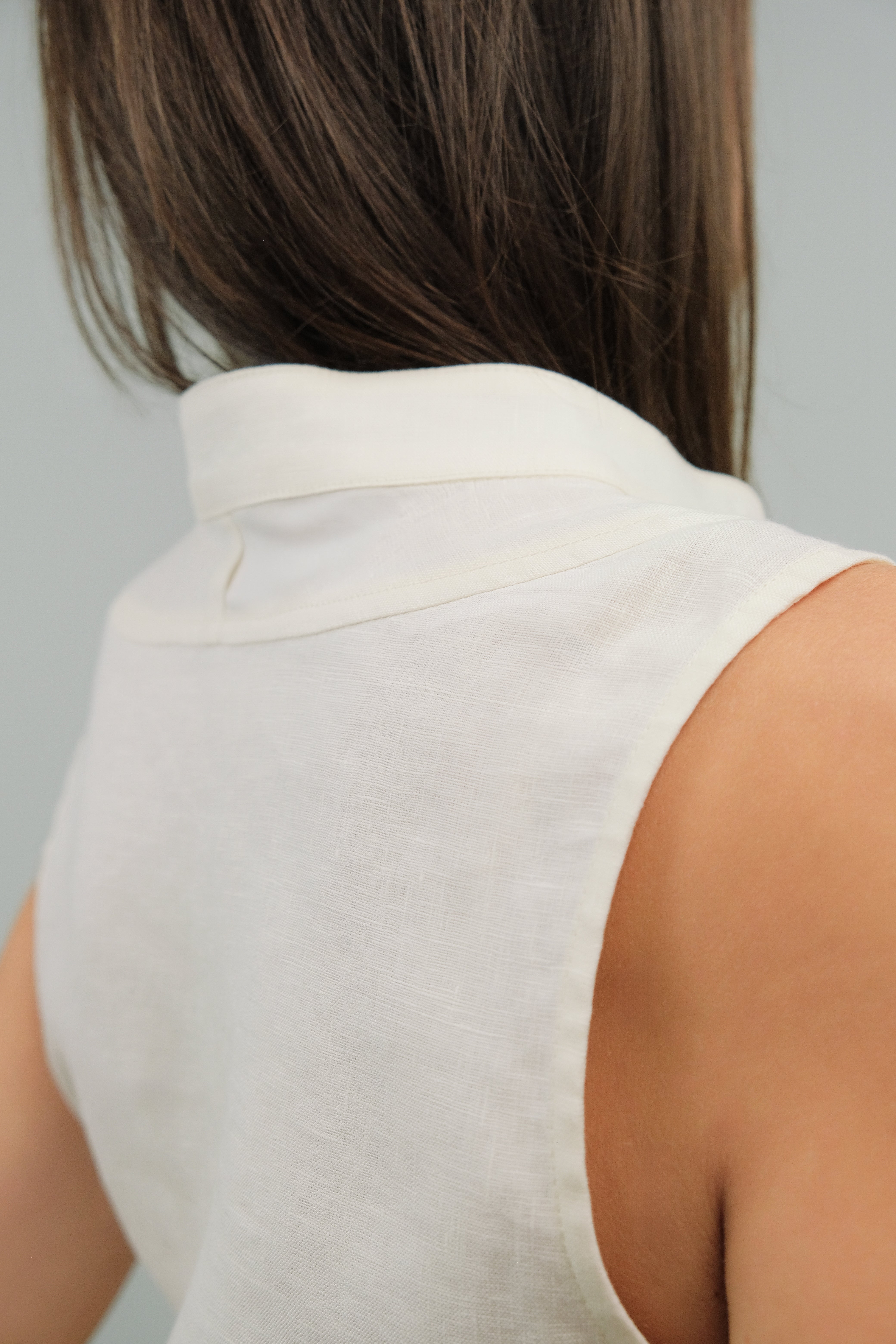 Our Wyatt Sleeveless Linen Shirt was designed for every woman, a classic tailored mandarin collar wardrobe staple and designed for every occasion!